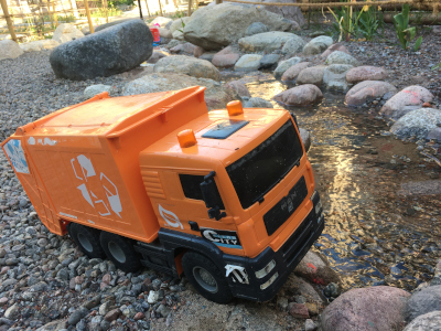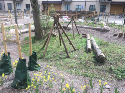 Vid sidan av två större träd finns en lekbäck med strömmande vatten, slingrande gångstigar kantade av stockar och stenar att hoppa på, samt en yta med sittplatser och en grill. En kompakt naturbaserad lösning. Vattnet till bäcken kommer från taket med regnvatten som samlas till en tank där pumpar cirkulerar vattnet i en renande biobädd med växter, genom vattenleken och till bevattning av ytorna med växtbäddar.