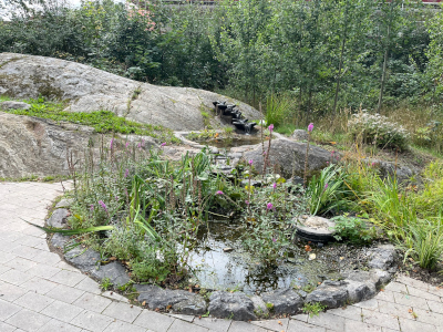 "Aquairis" är ett modulärt system med cirkulation och biologisk rening av vatten. På Karneolen leds vattnet från tre stuprör via ränndalar och specialkostruerade brunnar ner i en tank. Här finns en cirkulationslösning med en pump som lyfter vattnet till en vattentrappa och via biobäddar med växter leds sedan vattnet i ett rörsystem tillbaka till tanken.